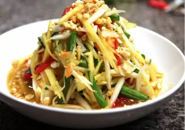 سالاد پاپایا، یا به زبان تایلندی "سوم تام" (Som Tum)، یکی از معروفترین و محبوبترین سالادهای تایلندی است که به عنوان یک غذای خیابانی در تمام نقاط تایلند یافت میشود. این سالاد با طعم تند، ترش، شیرین، و کمی شور، ترکیبی منحصربهفرد و دلپذیر از مزهها را ارائه میدهد. سوم تام اصالتاً از شمال شرقی تایلند و کشور همسایه، لائوس، نشأت گرفته و بهمرور به یکی از نمادهای آشپزی تایلندی تبدیل شده است.