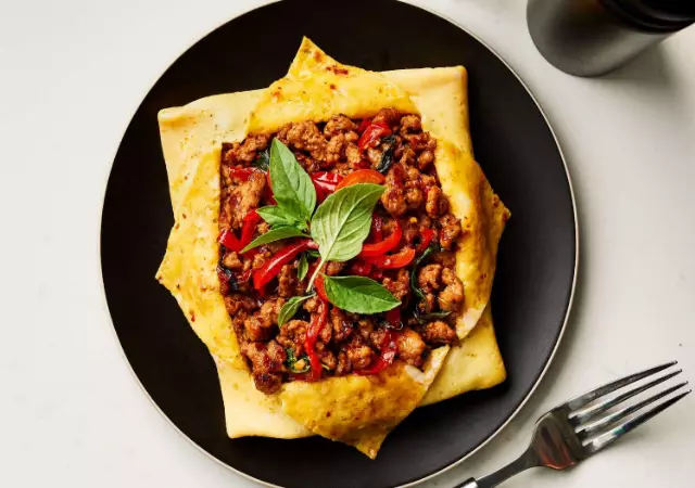 - پرکردن و تا کردن تخممرغ: زمانی که تخممرغ کمی بسته شد اما هنوز کمی نرم است، مخلوط گوشت و سبزیجات را به وسط آن اضافه کنید. سپس با استفاده از کفگیر، لبههای تخممرغ را به آرامی روی مواد جمع کنید و تخممرغ را مانند یک پاکت تا کنید.